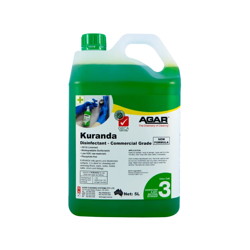 Agar Kuranda goes beyond ordinary cleaners — it cleans and disinfects floors, walls & high‑touch surfaces in commercial sites, while being plant‑derived, low‑VOC and GECA‑certified. Professional results with a green conscience.